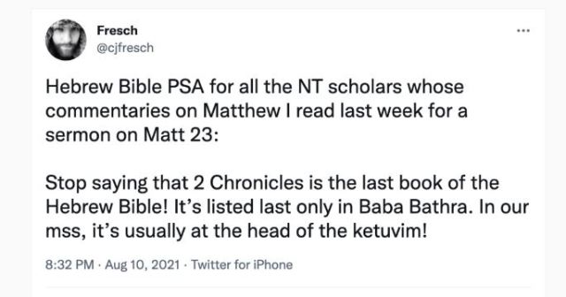 Among his selections for the August Biblical Studies Carnival, Brent Niedergall listed a recent Tweet by Chris Fresch @cjfresch. Fresch chided scholars who say that the book of Chronicles is the last book of the Hebrew Bible. He wrote, “Stop saying that 2 Chronicles in the last book of the Hebrew Bible! It is listed last only in Baba Bathra. In our mss, it’s usually at the head of the kethuvim.”